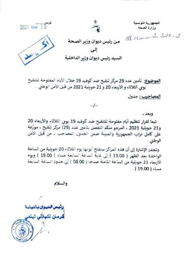 رسالة قالت منظمة انا يقظ انها تحصلت عليها و هو ما "يكذب مزاعم رئيس الحكومة بعدم اعلام وزارة الداخلية بحملة التلقيح " بحسب ما جاء في التدوينة.